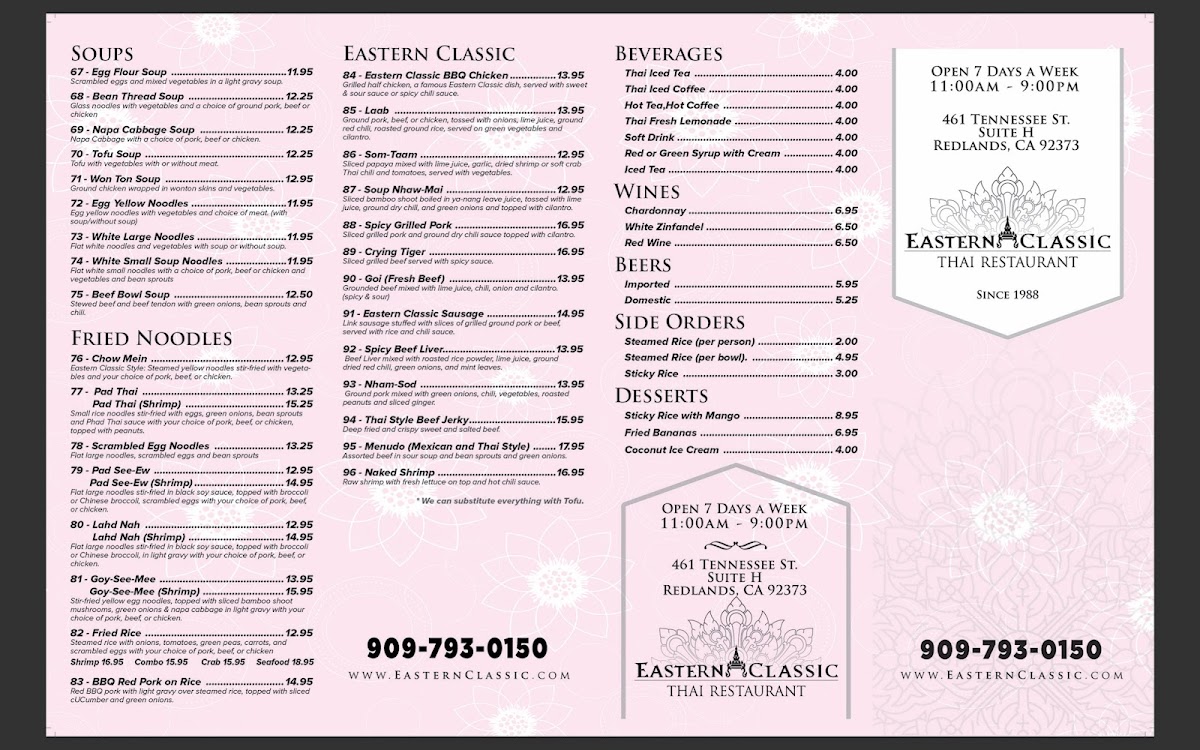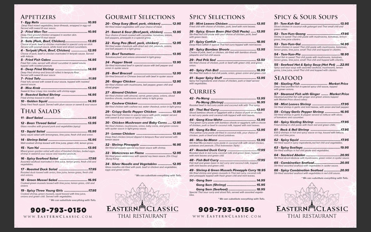 This menu features a variety of traditional Thai dishes organized into several categories, offering options for casual dining and a full meal experience. It includes Thai salads, seafood, and side orders to complement main dishes.